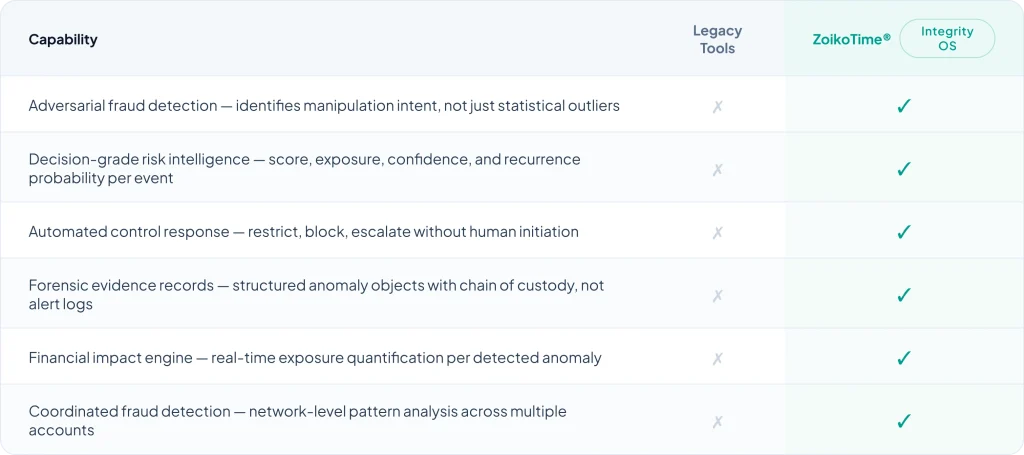 ZoikoTime gives your organisation the adversarial detection intelligence, automated control infrastructure, and forensic evidence capability needed to protect the integrity of every workforce decision — before manipulation reaches your financial records.