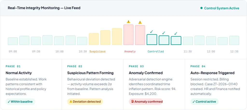 ZoikoTime automates detection and control at machine speed — while ensuring human judgement governs every consequential outcome, investigation, and resolution.