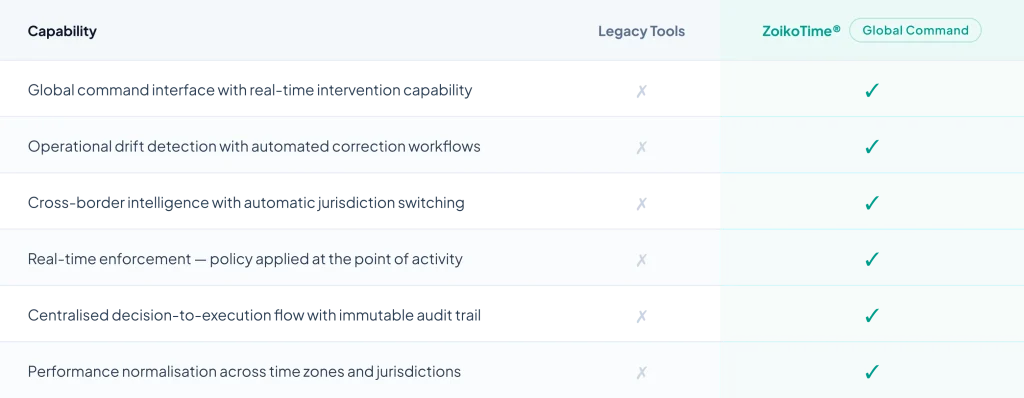 ZoikoTime gives your organisation the command infrastructure, cross-border intelligence, and enforcement capability needed to operate a global distributed workforce — with confidence, consistency, and control.