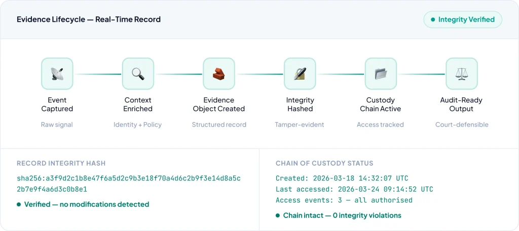 Evidence is not assembled retrospectively from logs. It is constructed at the instant the event occurs — no delay, no reconstruction, no gaps.