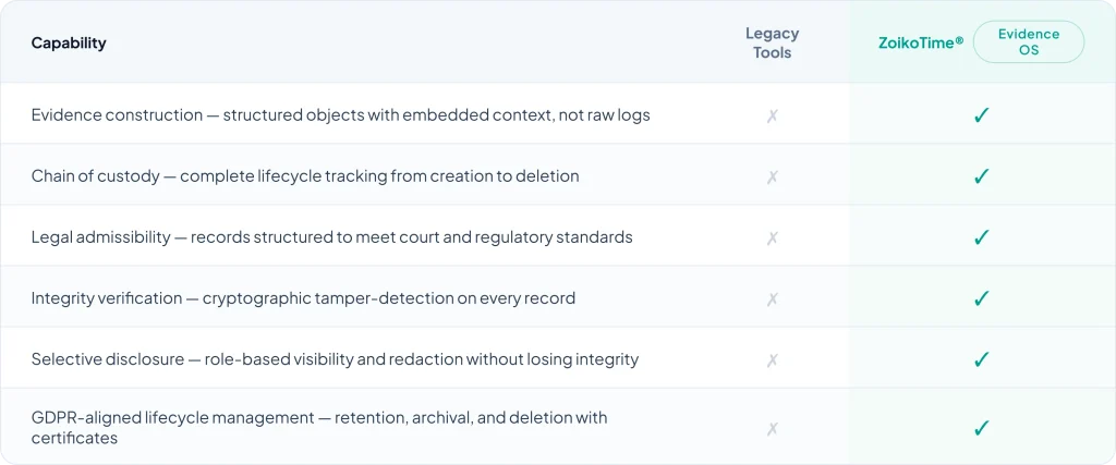 Legacy tools create logs. ZoikoTime creates evidence. The gap between the two determines whether your organisation can defend its decisions when it matters most.