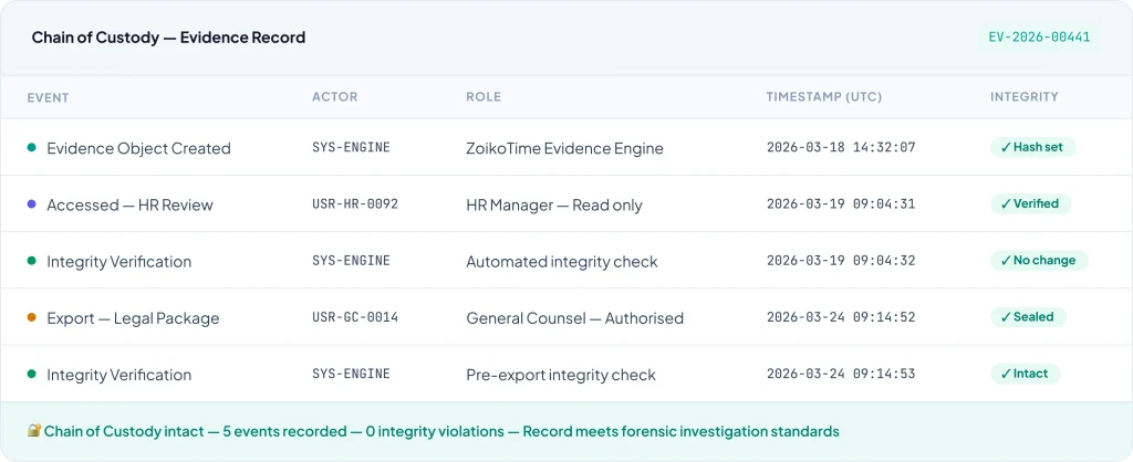 ZoikoTime captures, constructs, and preserves forensic-grade evidence for every workforce action — ensuring every decision can be verified, audited, and legally defended.