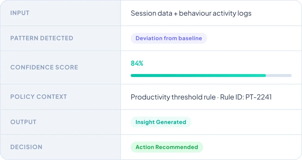 Inputs, patterns, confidence score, policy context per insight