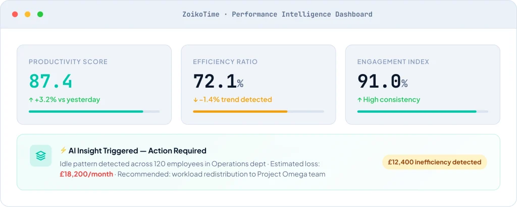 ZoikoTime transforms verified workforce activity into explainable, decision-grade intelligence — enabling organisations to act with precision, confidence, and accountability.