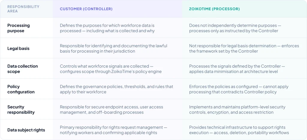 ZoikoTime does not independently determine purposes of processing. Every processing activity is governed by Controller instruction within the ZoikoTime policy framework.