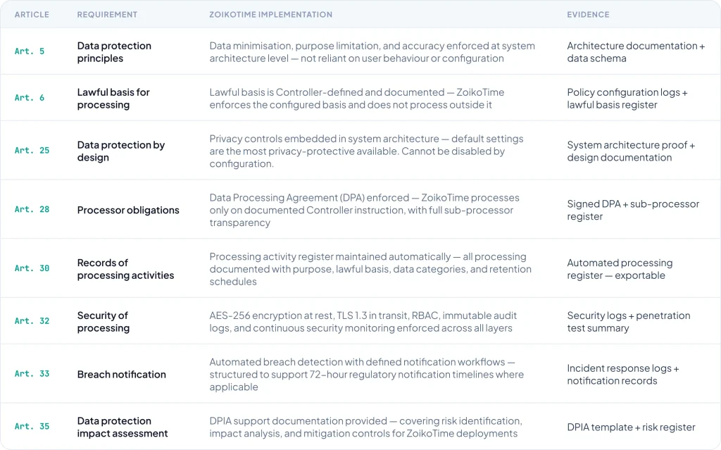 ZoikoTime operates exclusively as a data processor — never as an independent data controller.