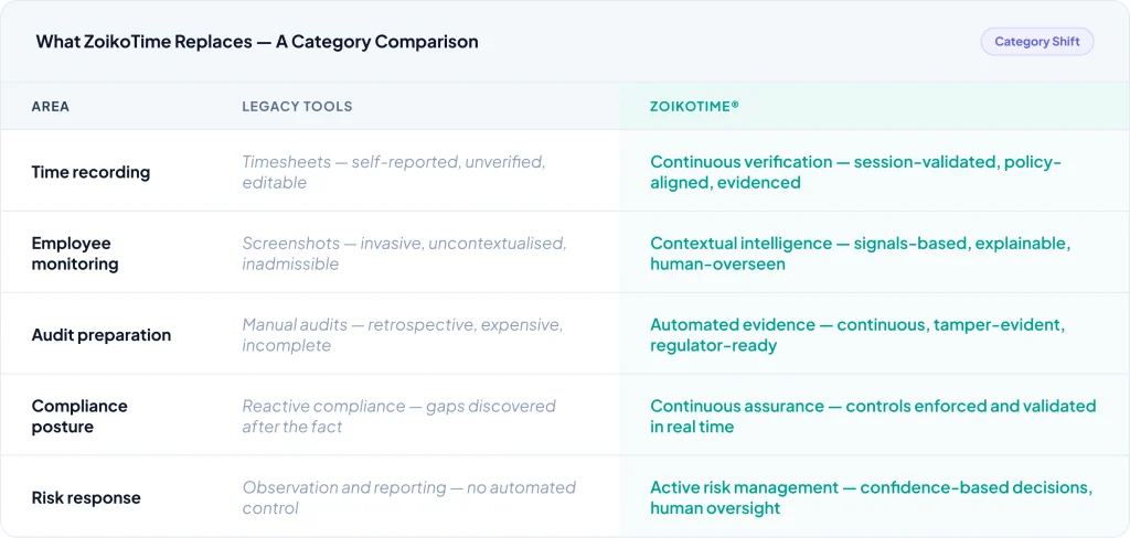 ZoikoTime does not improve legacy workforce tools — it replaces the category with workforce assurance infrastructure that those tools were never designed to provide.