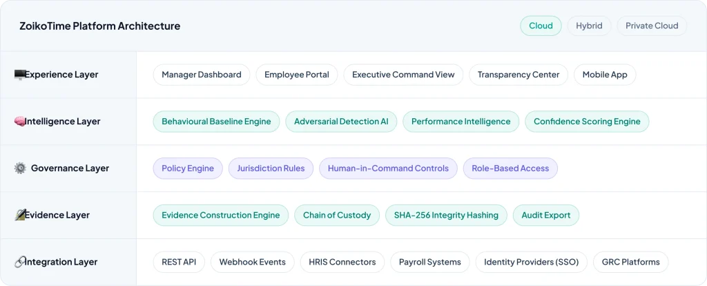 "ZoikoTime is designed to provide audit-ready workforce assurance. It does not replace human judgment and is governed by configurable oversight policies. Human-in-Command is a foundational design principle — not a product feature."