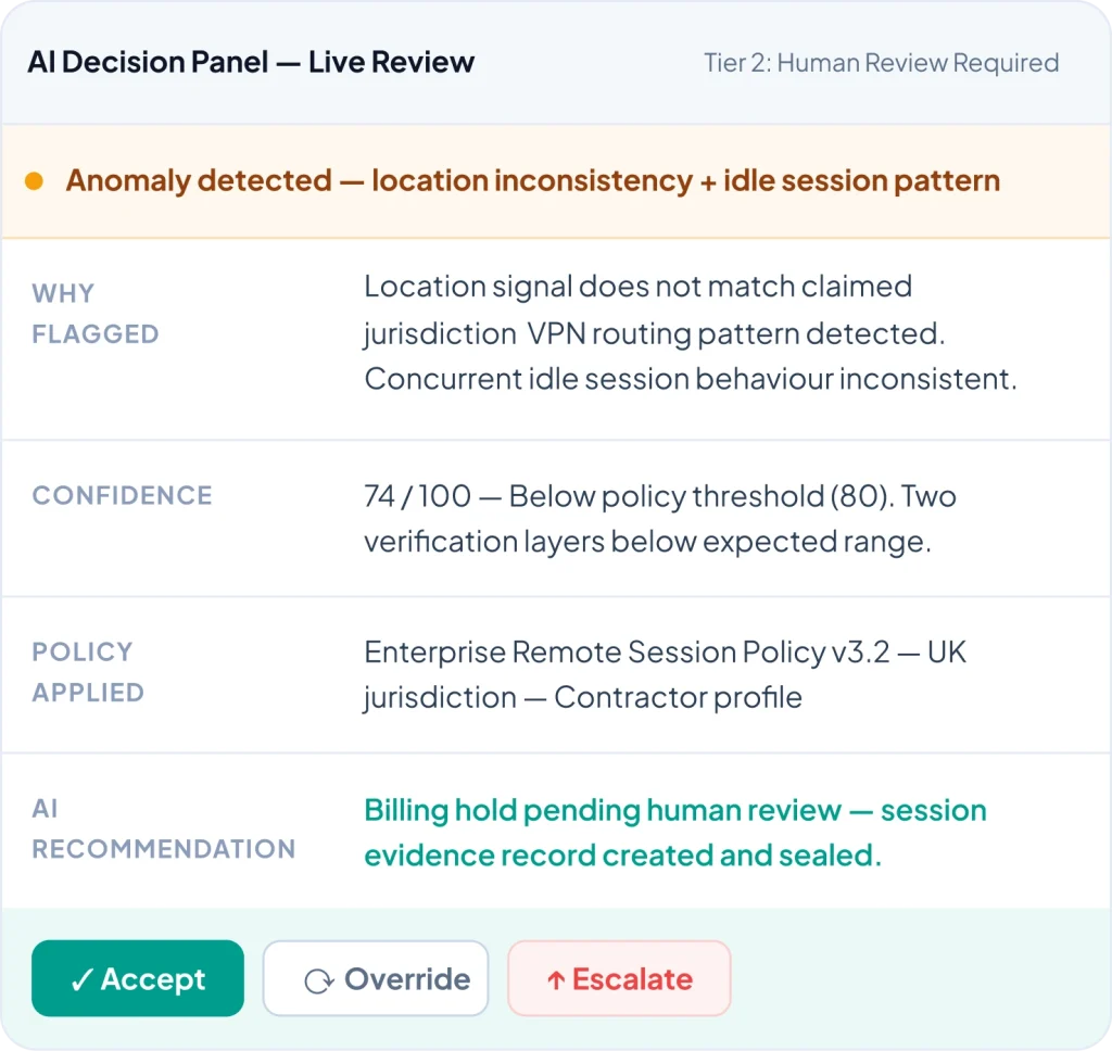Scenario: A worker logs in successfully. Mid-session, the device remains consistent, but behavioral signals deviate. Confidence score drops → session flagged → payroll eligibility reviewed → evidence automatically generated.