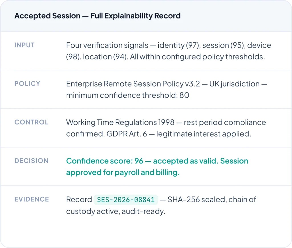 Audit, legal, and regulatory readiness requires explainability — not just records. Every ZoikoTime decision includes the input, policy, control, AI reasoning, and evidence output.