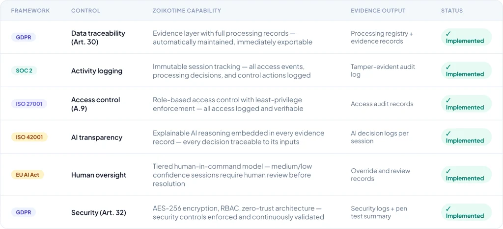 Procurement-grade clarity — a complete mapping of ZoikoTime capabilities to the compliance controls your regulators, auditors, and procurement teams require.