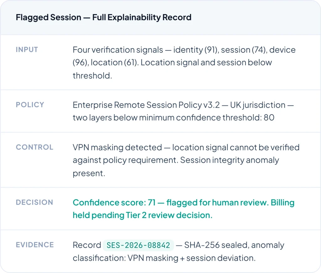 All consequential decisions require human review — flagged sessions, anomaly classifications, and policy exceptions are reviewed by named, accountable human decision-makers.
