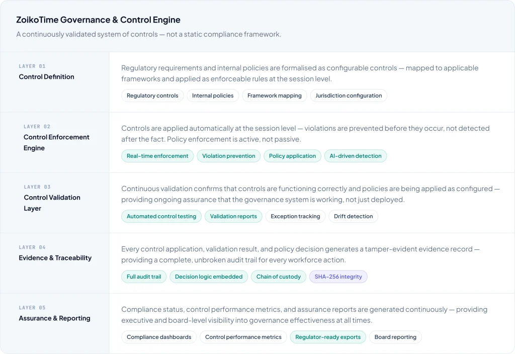 ZoikoTime enables organisations to operate with continuous compliance, verifiable controls, and audit-