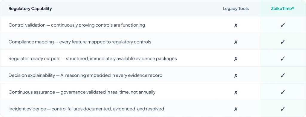Legacy tools were built for operational tracking — not regulatory defence. The capabilities that matter to regulators are absent from every major incumbent platform.