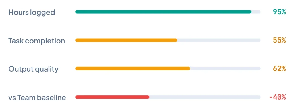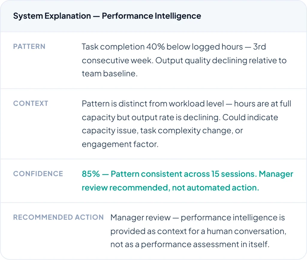 Consultant K. Adams is showing a 40% gap between logged hours and verified task completion — below team baseline for the third consecutive week. The performance intelligence engine has flagged this pattern for manager review.