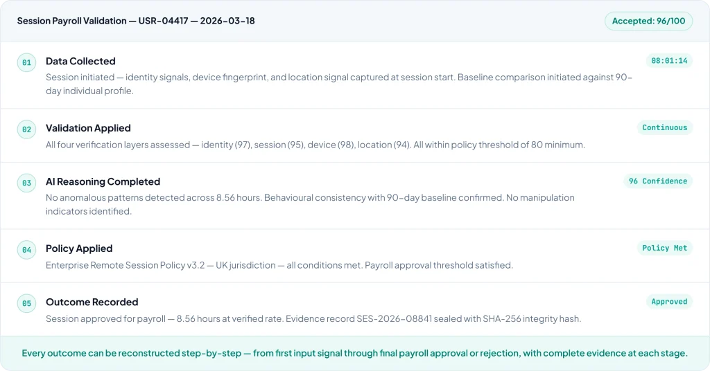 The system collects “Proof of Presence” data, which includes timestamped session logs, location validation, and periodic identity verification. This creates a tamper-evident record used to eliminate payroll disputes and satisfy regulatory audits.​