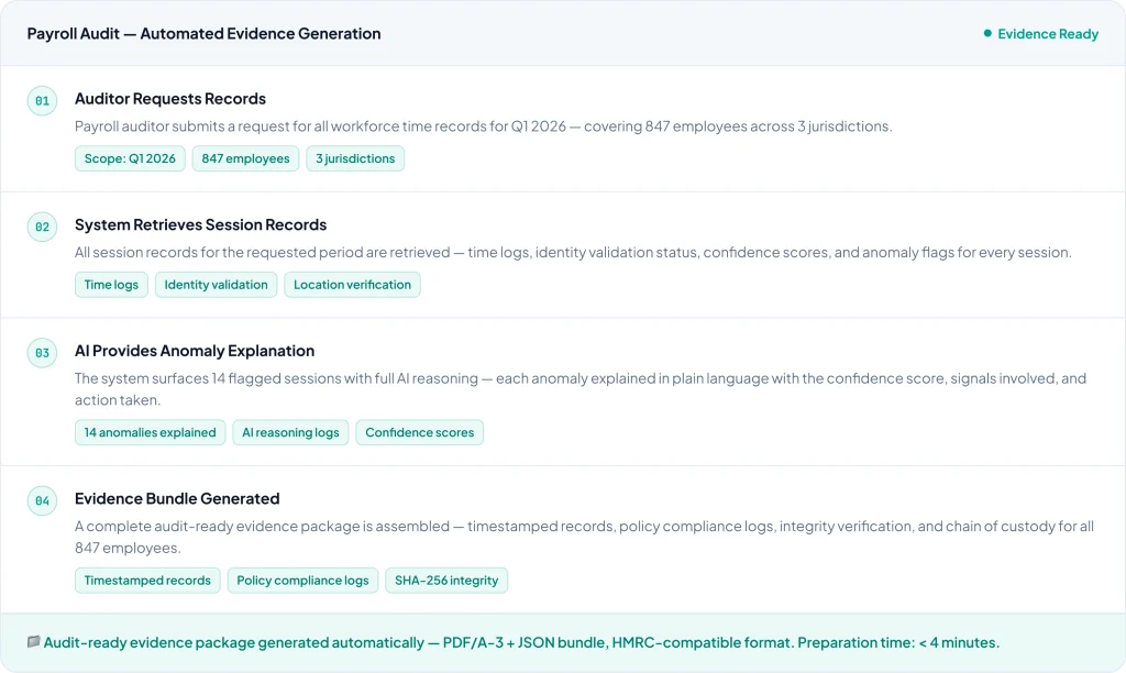 Every workforce action generates a tamper-evident evidence record — automatically, at the point of occurrence. No retrospective reconstruction, no manual compilation.