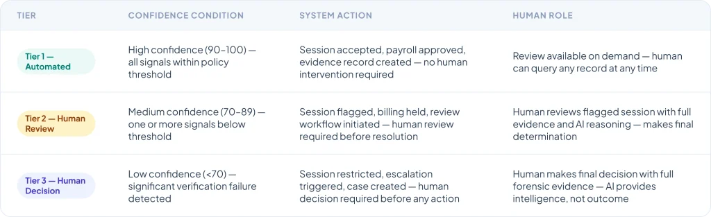 Human-in-command at every consequential decision point — the AI surfaces risk and intelligence, humans retain decision authority. No automated disciplinary outcomes, ever.