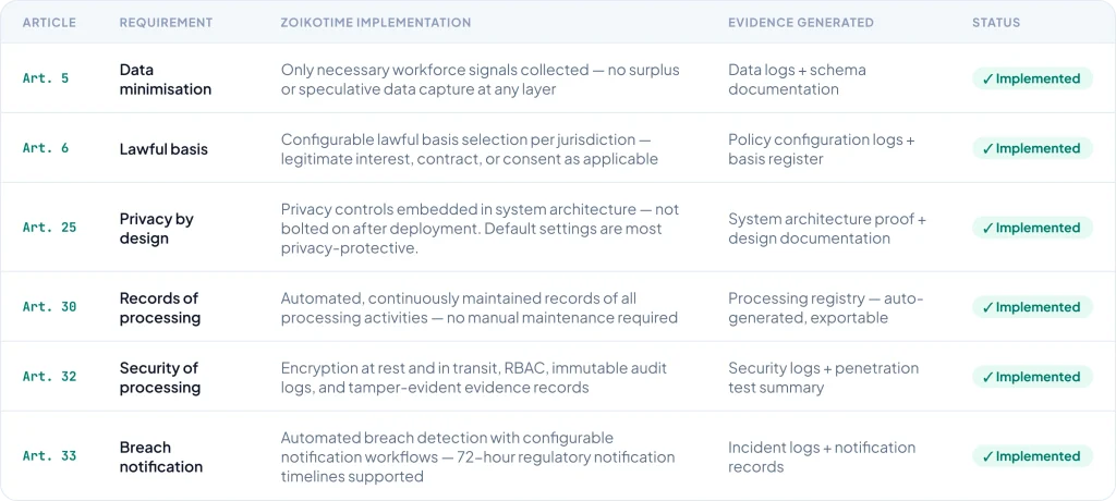 Data governance is not a compliance checkbox in ZoikoTime — it is a system design requirement applied at every layer of data capture, processing, and retention.