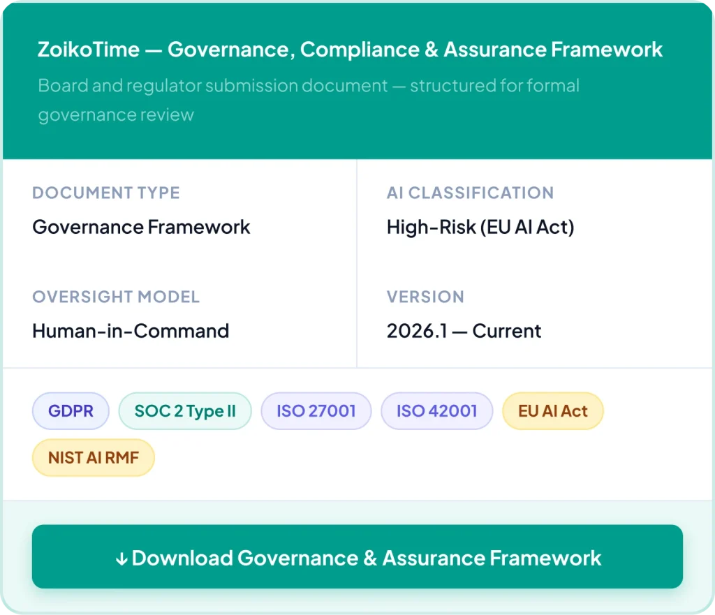 ZoikoTime is designed to withstand regulatory scrutiny, procurement due diligence, and legal challenge — with full compliance mapping, audit workflow simulations, and board-ready documentation available to every enterprise client.