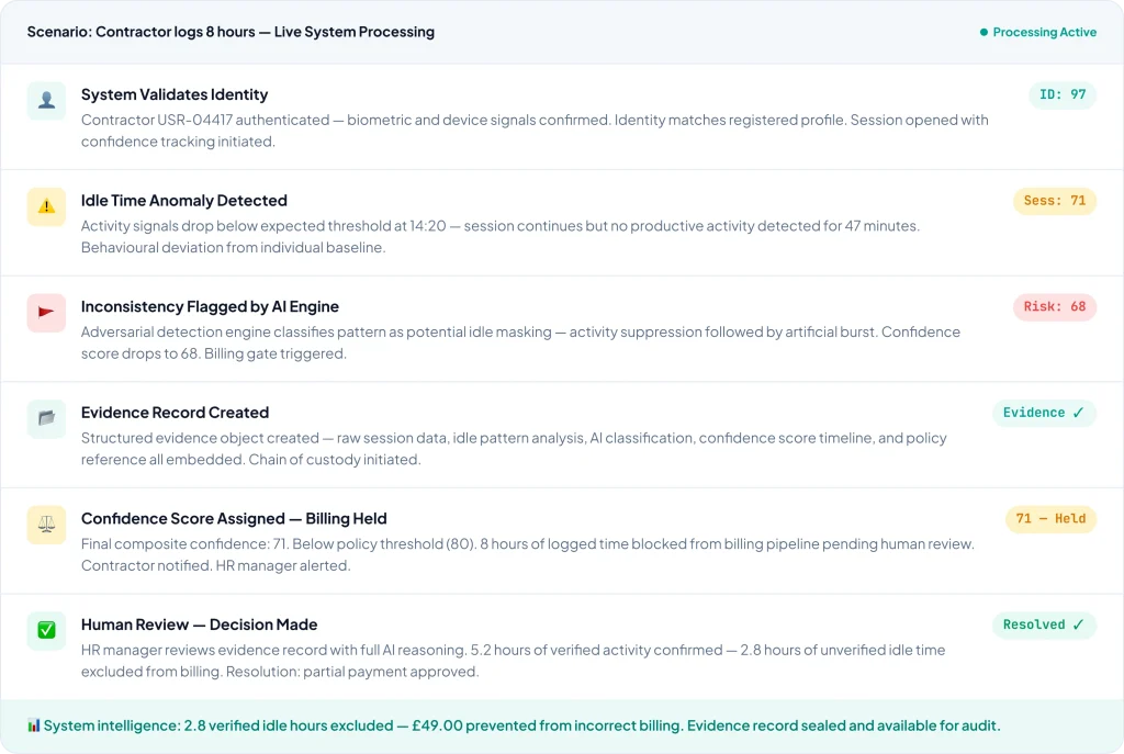 A contractor logs 8 hours. ZoikoTime processes every signal in real time — identity, execution, quality, and billing validity — producing a decision and evidence record in seconds.